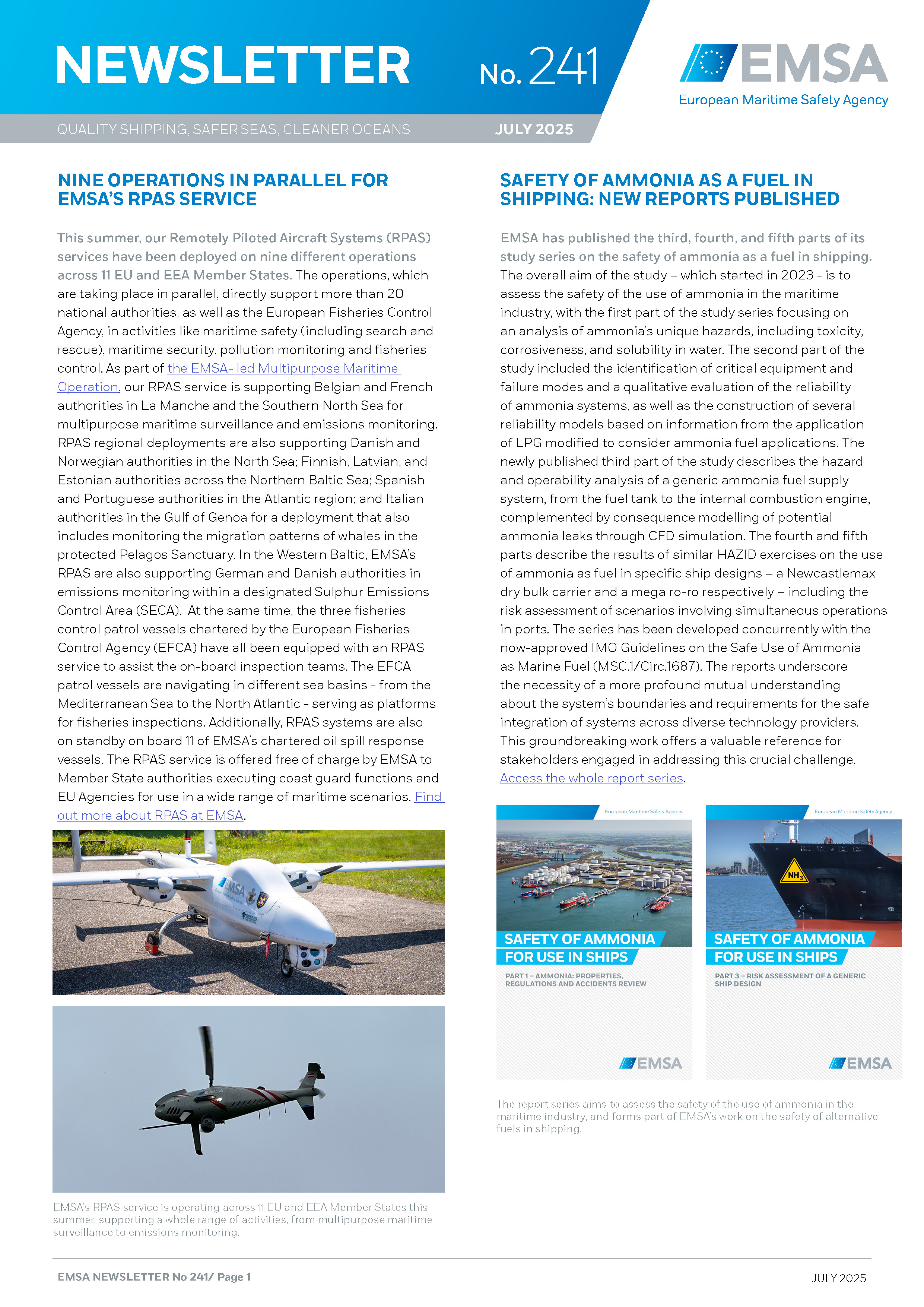 In this month’s EMSA Newsletter we have all the latest on our summer RPAS deployments as well as news on new studies in our safety of ammonia as a fuel in shipping series. There’s also a look at our recent meeting on the revision of the STCW Convention and Code!